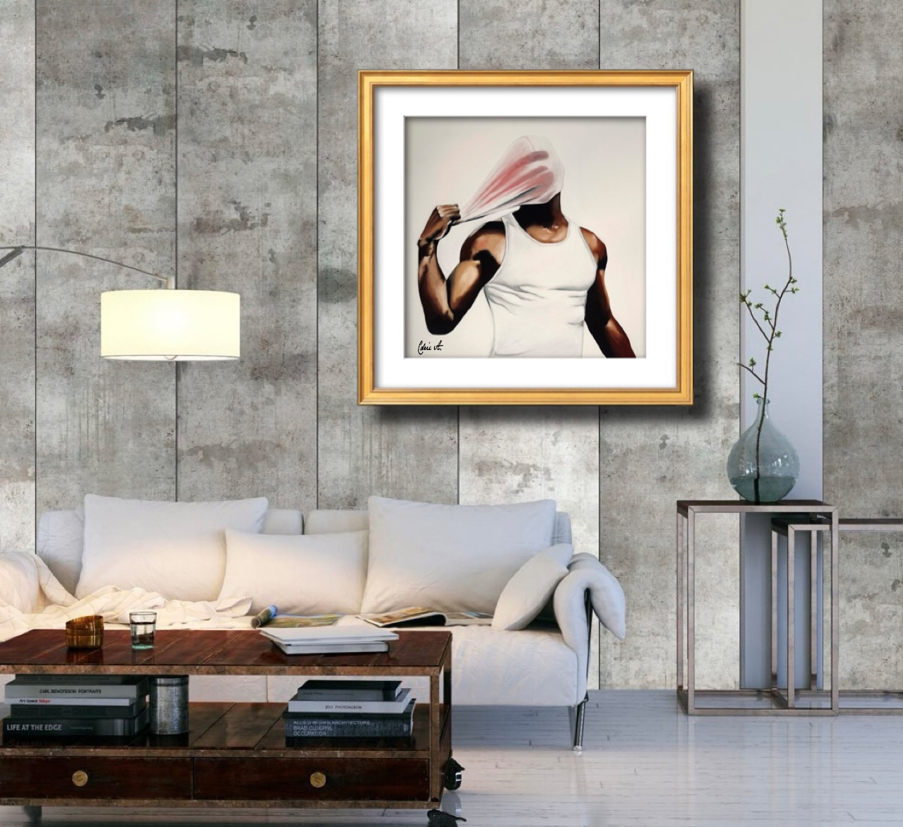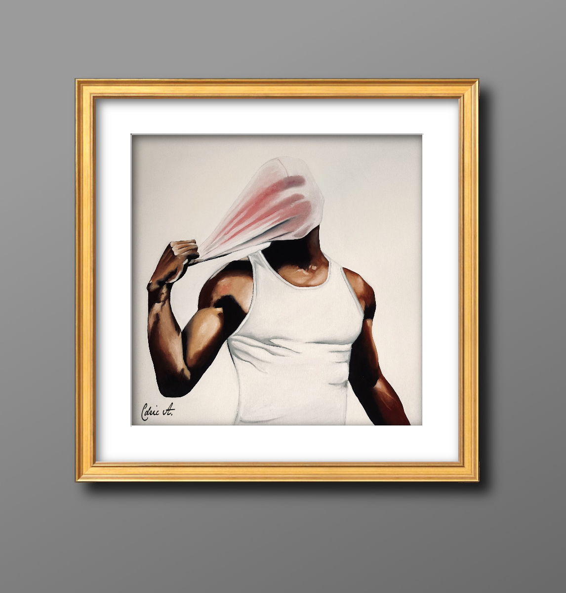 La scène évoque la peur qui réside derrière la cagoule, un masque souvent porté pour dissimuler les émotions, les intentions ou l’identité. Dans ce geste de retrait, l’homme semble libérer non seulement son visage, mais aussi ses angoisses intérieures, ses doutes et ses vulnérabilités. L’art de ce moment saisit l’essence d’un conflit intérieur, un combat entre l’auto-protection et la vérité. Le contraste des ombres et des lumières sur la toile intensifie l’effet dramatique, mettant en valeur la tension palpable de la scène.