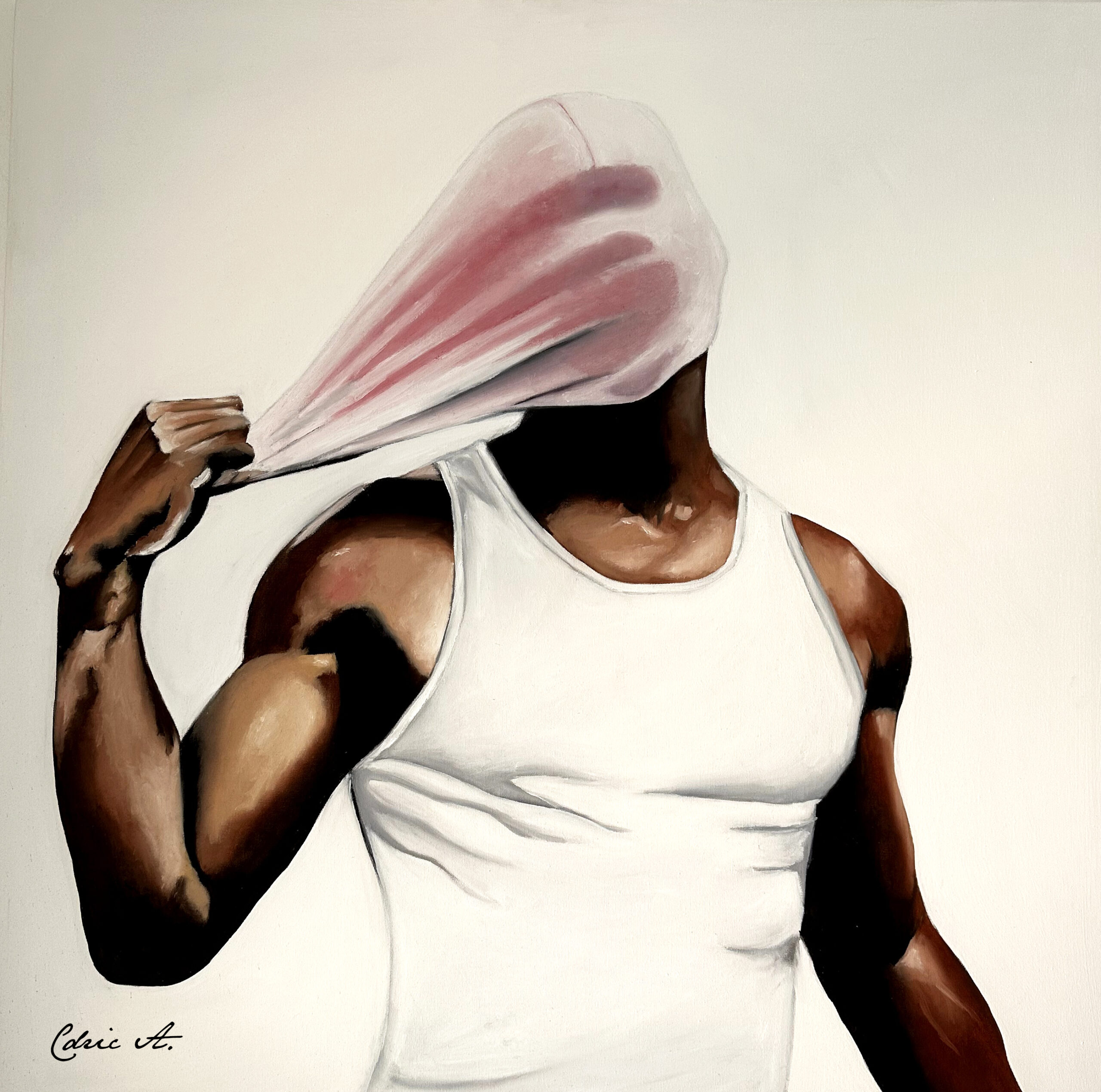 Ce tableau, réalisé en peinture à l’huile sur toile, capture un moment intense et révélateur, où un homme s’apprête à arracher son masque de cagoule. Le geste vif et décisif de l’arrachage du masque symbolise non seulement une libération physique, mais aussi une confrontation avec soi-même, un acte qui semble déchirer le voile de l’illusion pour exposer la vérité nue.